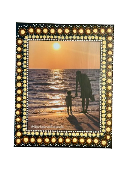 This beautiful handmade photo canva 11"x14", adorned with mandalas in the corners, shows three children playing by the sea at sunset. When I took this photo, I captured the children's connection and natural playfulness as they played with the waves.